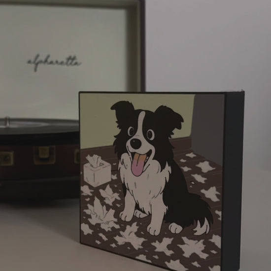 Brighten up any space with this adorable LED light box featuring a charming Border Collie design. This delightful shadow box showcases a happy Border Collie with its signature black and white coat and tongue out, set against a cozy indoor scene with scattered white shapes that create a playful, dynamic backdrop.